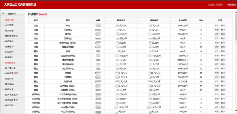大庆盐业公司进销存管理系统实现前台开票、退货、营销派单、客户档案、销售统计、商品入库、出入库记录、库存管理、库存统计、库存调配、生产调拨、权限分配等功能需求。