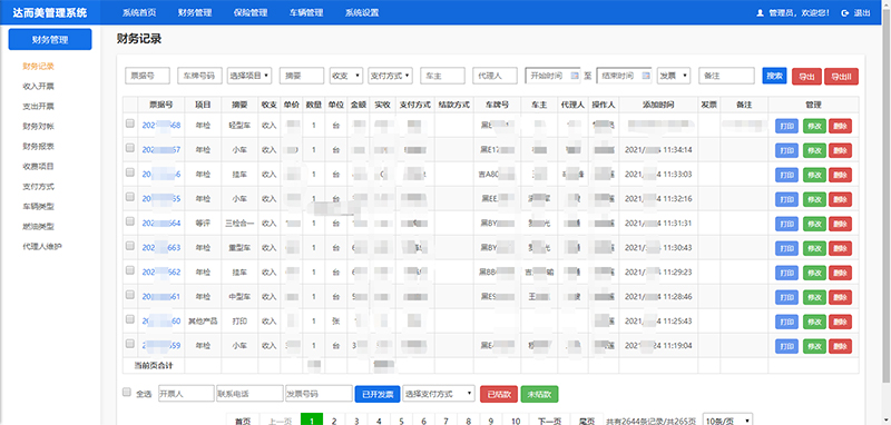 达而美机动车检测站管理系统实现前台开票、打印小票、财务对帐、报表统计、保险计算、车辆档案库、车辆到期提醒、人员工资计算、月底导出工资报表及工资单、系统按不同用户实现权限分配等功能需求。